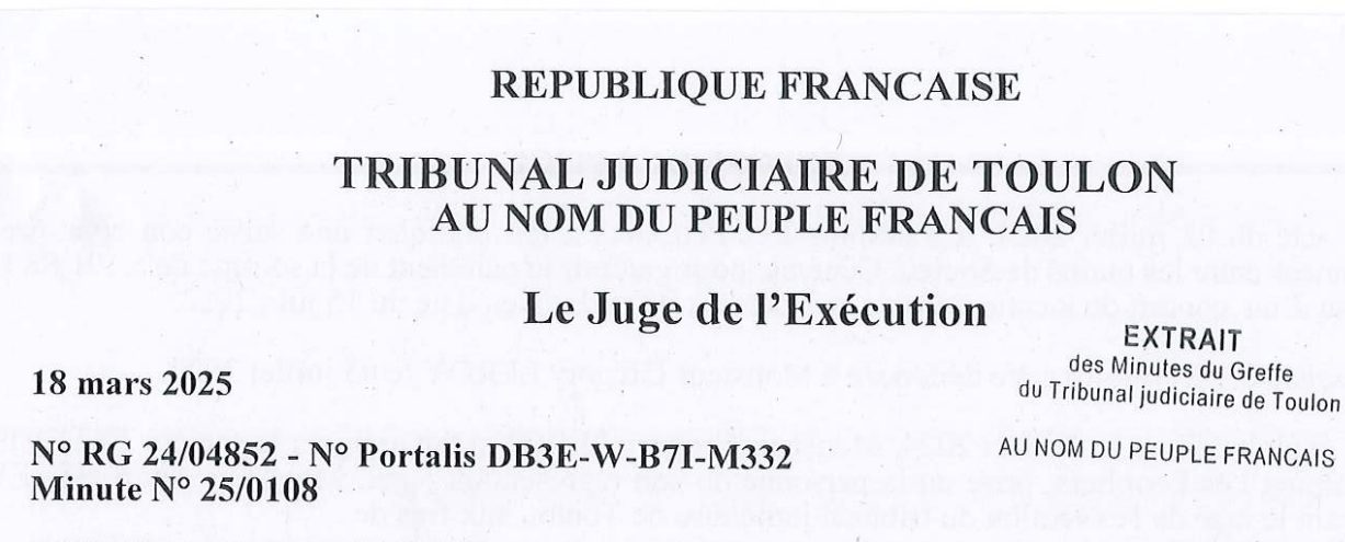 AINSI JUGE ET PRONONCE PAR MISE A DISPOSITION AU GREFFE DU JUGE DE L’EXECUTION DU TRIBUNAL JUDICIAIRE DE TOULON, LE DIX HUIT MARS DEUX MILLE VINGT CINQ.